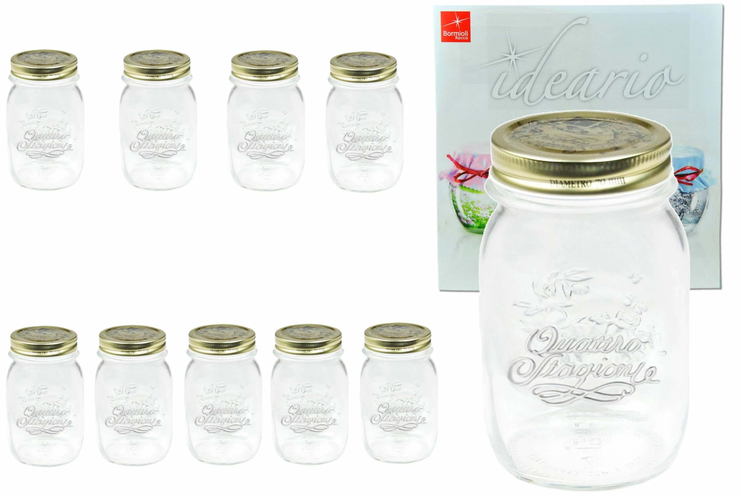12er Set Original QUATTRO STAGIONI Flasche von Bormioli Rocco, 1000 ml, mit Deckel, Vorratsglas, Einmachglas, Deko-Glas, inkl. Original Bormioli Rezeptheft